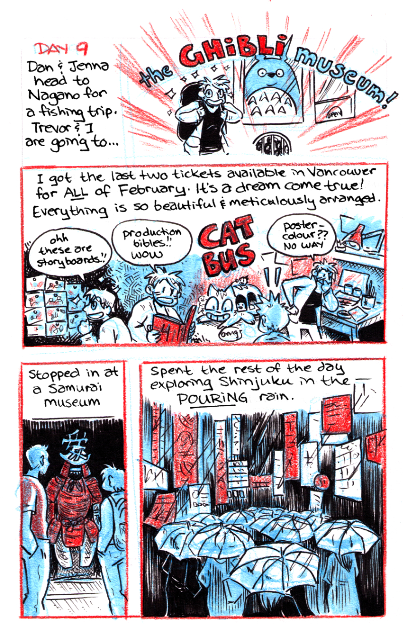 Travelogue completed by Jam in 2016 based on a two-week trip to Japan they took with friends. Ink, Marker and Pencil-Crayon.