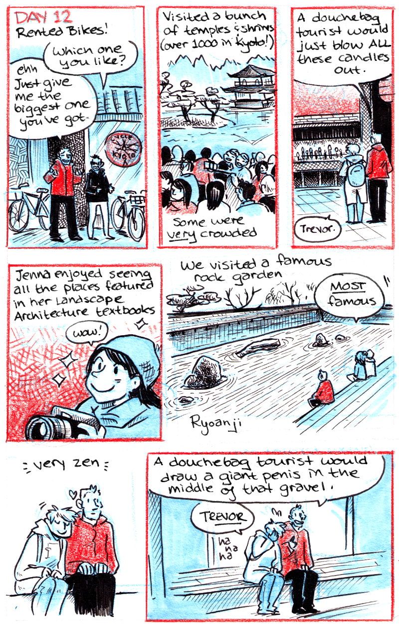 Travelogue completed by Jam in 2016 based on a two-week trip to Japan they took with friends. Ink, Marker and Pencil-Crayon.