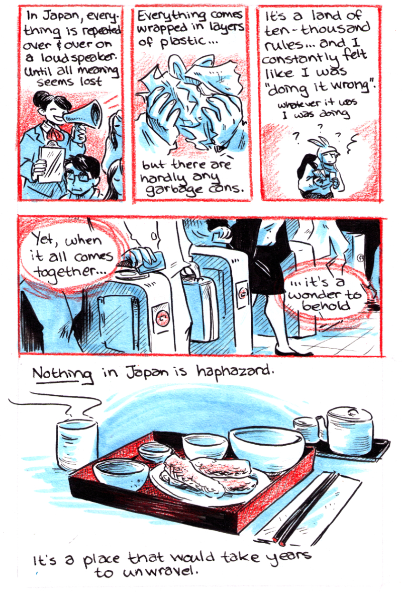 Travelogue completed by Jam in 2016 based on a two-week trip to Japan they took with friends. Ink, Marker and Pencil-Crayon.
