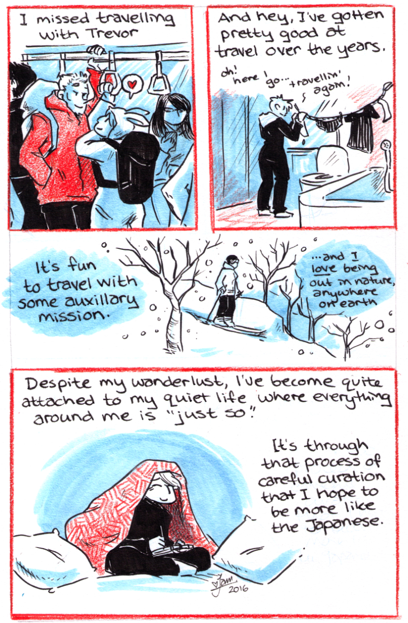 Travelogue completed by Jam in 2016 based on a two-week trip to Japan they took with friends. Ink, Marker and Pencil-Crayon.