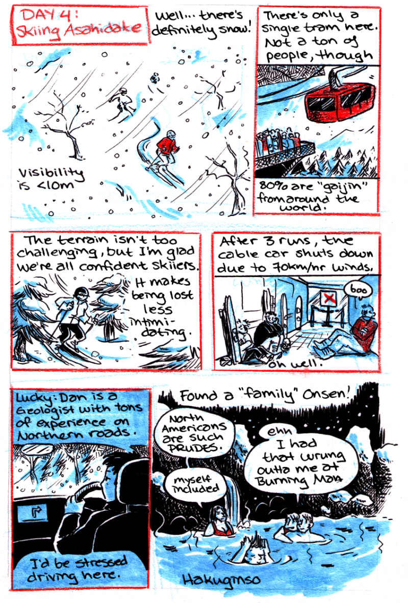 Travelogue completed by Jam in 2016 based on a two-week trip to Japan they took with friends. Ink, Marker and Pencil-Crayon.