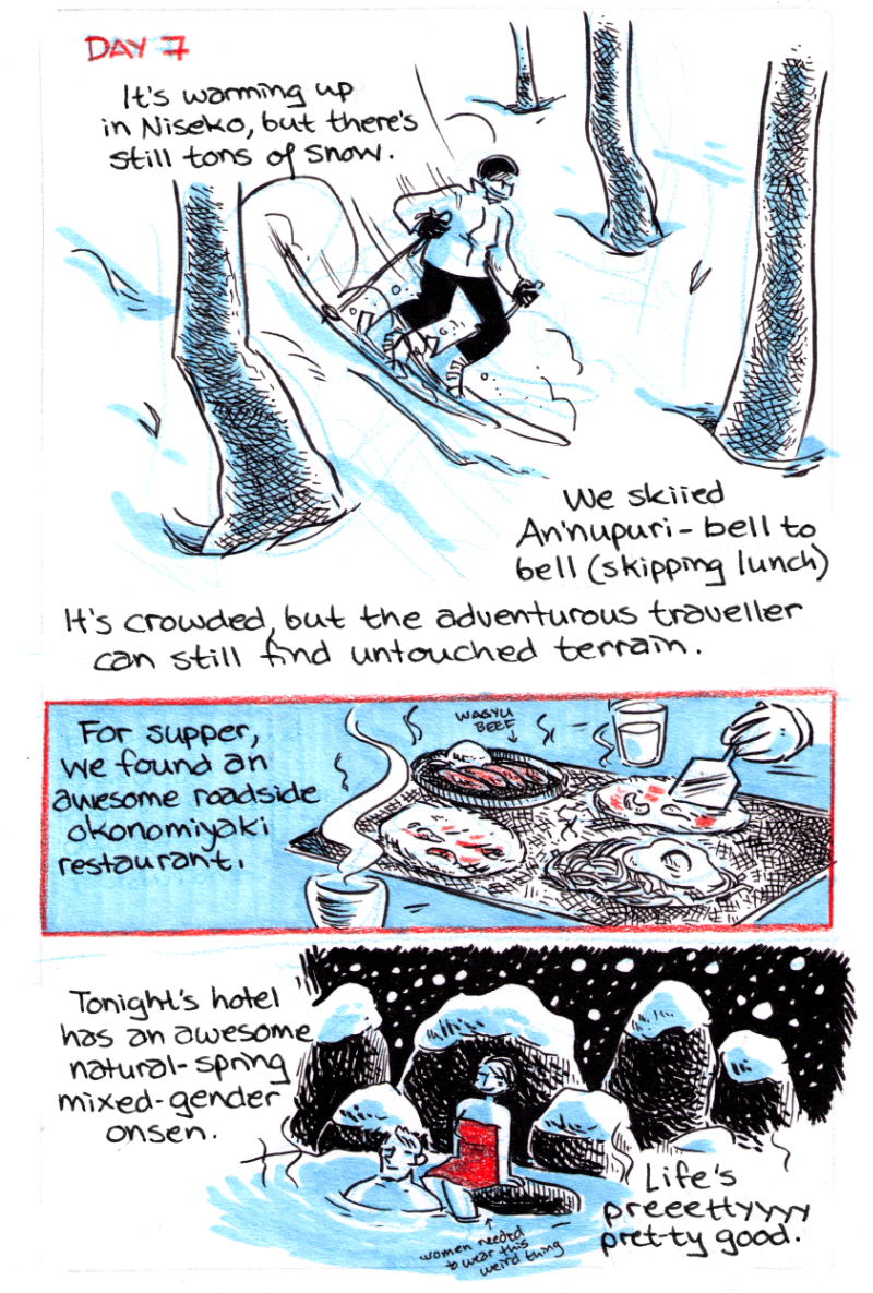 Travelogue completed by Jam in 2016 based on a two-week trip to Japan they took with friends. Ink, Marker and Pencil-Crayon.