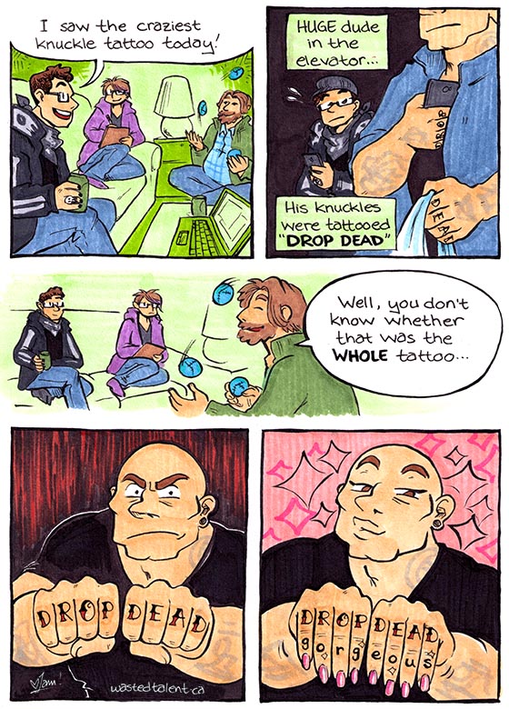 Jam maintained a weekly autobiographical comic about their life as a young professional, Vancouverite, mechanical engineer and weirdo between 2004 and 2016. Below is an exceprt, but the full archive is available at WastedTalent.ca